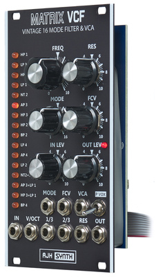 De AJH Synth Matrix VCF black is een veelzijdige Eurorack module met 16 selecteerbare filtertypes, waaronder lowpass, bandpass en highpass. Met controls voor frequentie, resonantie en modus, elk met CV-input, biedt deze analoge multimode filter met VCA eindeloze mogelijkheden voor sound shaping. Een must-have accessoire voor elke synthesizer liefhebber!