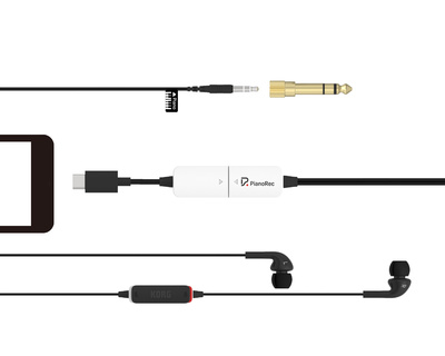 Korg PianoRec, Recording Device for Digital Piano, Direct cable connection between piano and smartphone, Compatible with standard camera and audio apps@+*Delivery contents:*, USB adapter cable (USB type A to type C), 3.5 mm Mini jack adapter to 6.3 mm jack (stereo), Earpiece attachments (S, M, L), Carry bag, Instructions manual