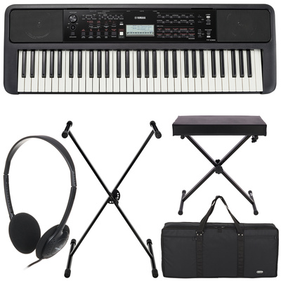 Yamaha PSR-E383 Deluxe Bundle@+*Pakketaanbieding bestaande uit*, Yamaha PSR-E383@+*Keyboard*, Opvolger van de PSR-E373, 61 Toetsen met aanslaggevoeligheid, 650 Sounds incl. 25 Drum/SFX kits, Dual, Split, 260 Styles, 10 user styles (SFF-formaat), One touch settings, 50 Chord progressions, Music Database met 200 items, 10 Registration Memories, 125 Songs, 48-Stemmige polyfonie, LCD display met achtergrondverlichting, Midi-recording: 5 songs met 2 tracks elk in eigen bestandsformaat, MIDI-player: SMF 0 & 1, Effecten: DSP (41), Reverb (15), Chorus (7), Master EQ (5), Harmony (26), Melody Suppressor, Metronoom, Leerfunctie, Luidsprekersysteem: 2x 2,5 W, Kan op batterijen worden gebruikt (6x AA LR6/R6/HR6 vereist, niet inbegrepen bij de levering), Afmetingen (B x D x H): 941 x 317 x 105 mm, Gewicht: 4,4 kg, Kleur: Zwart@+*Aansluitingen:*, Netvoeding, Koptelefoonuitgang/Line Out: 6,3 mm stereo-Jack, Sustain-pedaal (niet bij de levering inbegrepen), Aux-In: 3,5 mm stereo mini-Jack, USB to host (Midi & Audio)@+*Bij de levering inbegrepen:*, PSR-E383, Netvoeding (PA-130), Bladmuziekhouder, Productregistratiekaart, Songboek (beschikbaar als digitale download op de Yamaha-website), Thomann Keyboard Bag 1@+*Gigbag voor keyboard*, Materiaal: slijtvast nylon, Versterkte naden, 2 cm dikke voering, Met twee grote buitenzakken voor accessoires, Verstelbare handgrepen, Interne afmetingen (B x D x H): 980 x 430 x 170 mm, Millenium KB-2006 Keyboard Bench@+*Zitbank voor Keyboard*, Groot zitvlak, In hoogte verstelbaar van 49 tot 63 cm, Draagvermogen: 120 kg, Kunstlederen hoes, Gewicht: 5,5 kg, Kleur: Zwart, Millenium KS-1001@+*Keyboard-Standaard*, Met snelsluiter (X-stand), Verstelbare rubberen steunen, Ondersteuningsdiepte: 40 cm, In hoogte verstelbaar van 50 cm (breedte: 87 cm) tot 92 cm (breedte: 46 cm), Afmetingen in ingeklapte toestand: 101 x 50 x 8 cm, Max. draagvermogen: 20 kg, Gewicht: 2,5 kg, Kleur: Zwart, Bijpassende tassen: art. #501567# en art. #501562# (beide niet bij de levering inbegrepen), the t.bone HP 66@+*Stereo-Koptelefoon*, Dynamisch, On Ear, Impedantie: 32 Ohm, Frequentiebereik: 20 – 20.000 Hz, 2 m kabel, Incl. adapter van 3,5 mm naar 6,3 mm Jack